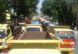 Demo Peringati Hari Buruh di Dompu, Puluhan Dum Truck Menutupi Jalan Protokol
