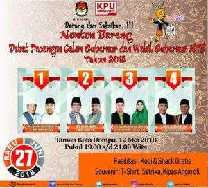 Terkait gawe lima tahunan itu, KPU Kabupaten Dompu menggelar Nonton Bareng (Nobar) di Taman Kota Dompu, pukul 19.00 – 21.00 Wita.