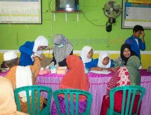 Siswa-siswi SMK Yapik Gerbang yang dipimpin Kepala Sekolah terkait, Ida Faridah, S.Pd dan didampingi sejumlah guru, melakukan pemeriksaan golongan darah dan tekanan darah terhadap masyarakat.