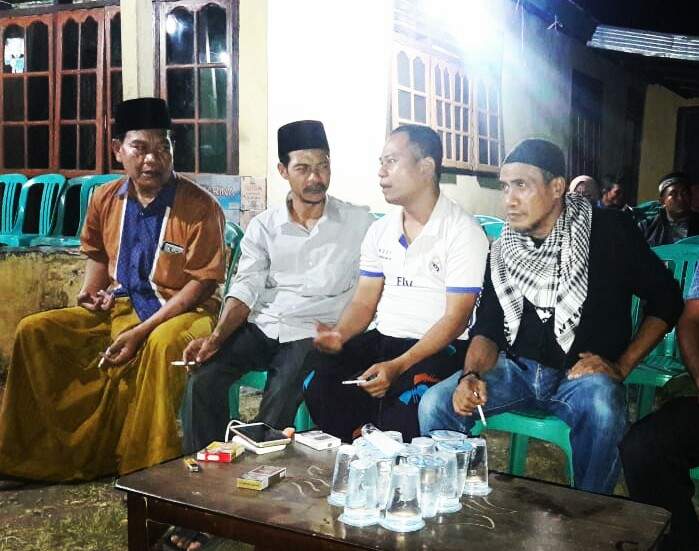 Suriadin, S.Pd, Kades Madaparama yang juga putra almarhum H. Burhan HM. Sidik (tiga dari kiri), bersama personel Lakeynews.com (dua dari kiri) dan Presiden RAN Foundation Muhammad Ruslan (paling kanan) di halaman rumah duka, Selasa (5/6/2018) malam. (ist/lakeynews.com)