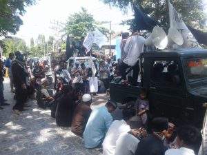 Setelah melakukan orasi secara bergantian Ketua FUI Kabupaten Dompu Ustadz Muhammad Taqiyudin, S.Pd, menyampaikan pernyataan sikap. Salah satu poinnya, menuntut Pemerintah Pusat dibawa kepemimpinan Presiden Joko Widodo dan Polri untuk menindaklanjuti atas tindakan yang dilakukan oknum Banser, beberapa waktu lalu.