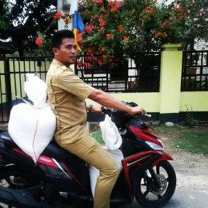 Saat itu, honorer tersebut sedang mengantarkan beras salah satu guru PNS yang mengajar di sekolah tempat dia bekerja. Tidak ada kata malu, ragu dan gengsi. Seragam dinas yang masih melekat pada tubuh, seolah bukan halangan bagi Su’ud dalam mengais rezeki nan halal.
