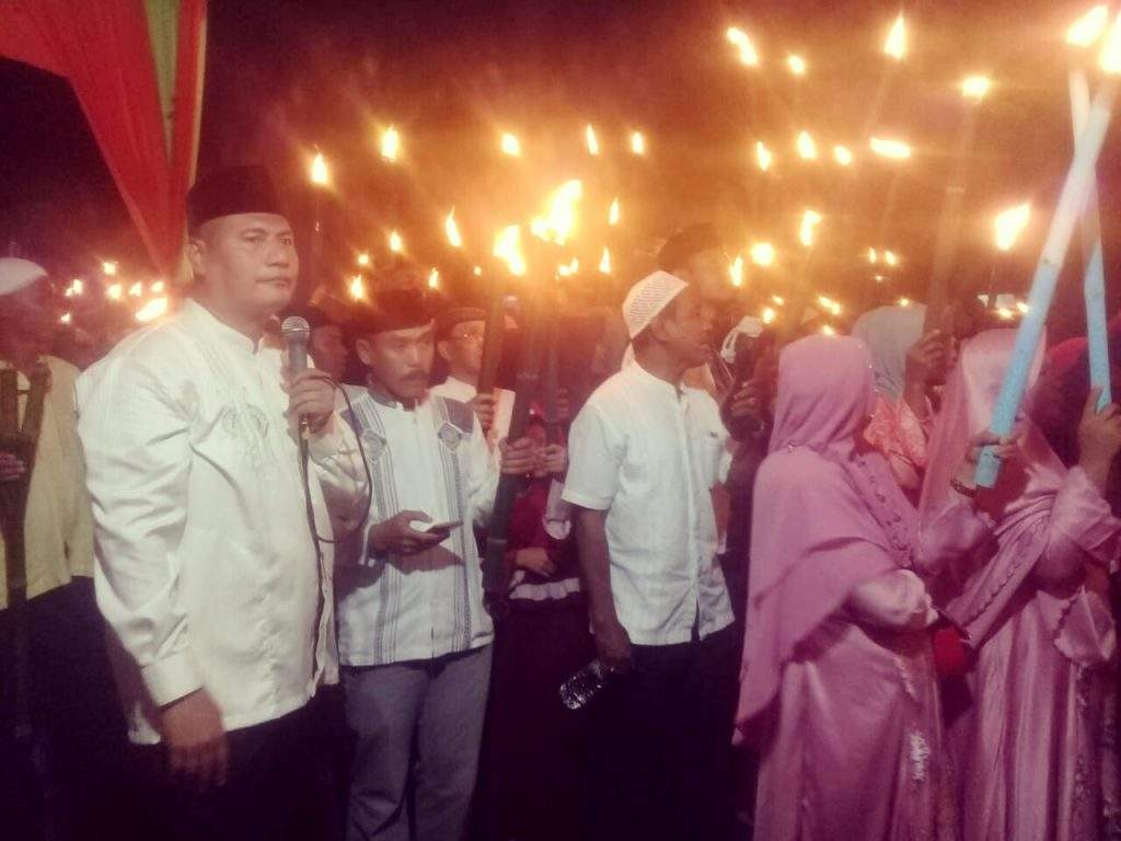 Bupati Dompu Drs. H. Bambang M. Yasin saat melepas peserta Pawai Obor di depan pintu timur Kantor/Pendopo Bupati, malam ini. (jon/lakeynews.com)