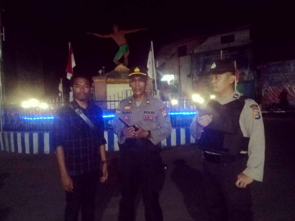 Kasubbag Humas Polres Dompu IPTU Sabri, SH dan anggotanya bersama wartawan Lakeynews.com di bundaran timur DPRD Dompu. (jon/lakeynews.com)