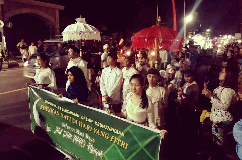 Umat Hindu ikut meramaikan malam takbiran keliling bersama ribuan warga muslim di Desa Narmada, Selasa (4/6/2019). (ist/lakeynews.com)