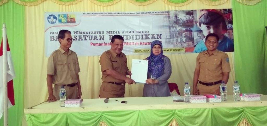 Kadis Dikpora Dompu H. Ichtiar Yusuf, SH dan Dr. Kulsum Nurhayati, M.Pd dari BPMRPK, menandatanganinya MoU Pemanfaatan Media Audio. (ist/lakeynews.com)