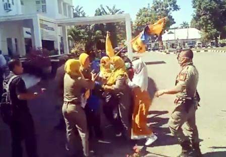 Ketegangan pun terjadi. Bahkan sempat terjadi tarik menarik dan perebutan beberapa atribut (dipegang mahasiswa) antara massa dan aparat Pol PP.
