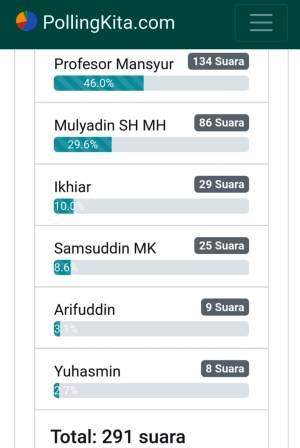 Untuk menguji pernyataan tersebut, mari kita lihat hasil poling yang sudah berkembang di media sosial akhir-akhir ini, dengan memunculkan bakal calon yang berbeda-beda untuk setiap poling. Tentunya hasil poling ini belum bisa dijadikan ukuran untuk kemenangan bakal calon, tetapi setidaknya ada data yang bisa kita jelaskan tentang kecenderungan pengguna media sosial yang ada di daerah ini, dibandingkan dengan pernyataan pemerhati media sosial (boleh adu data) yang berbicara atas subjektivitas dirinya sendiri.