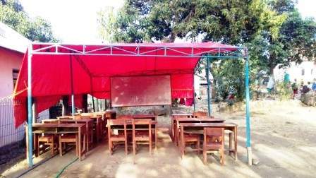 BIMA, Lakeynews.com – Siswa kelas 1 dan 2 SDN Tolonggeru, Desa Mbawa, Kecamatan Donggo, Kabupaten Bima, mulai Tahun Pelajaran (TP) 2019/2020, pertengahan Juli ini, mengikuti proses Kegiatan Belajar Mengajar (KBM) di halaman sekolah. Namun, sejak beberapa hari lalu, para peserta didik belajar di bawah tenda darurat beratapkan terpal yang dibuat pihak sekolah.