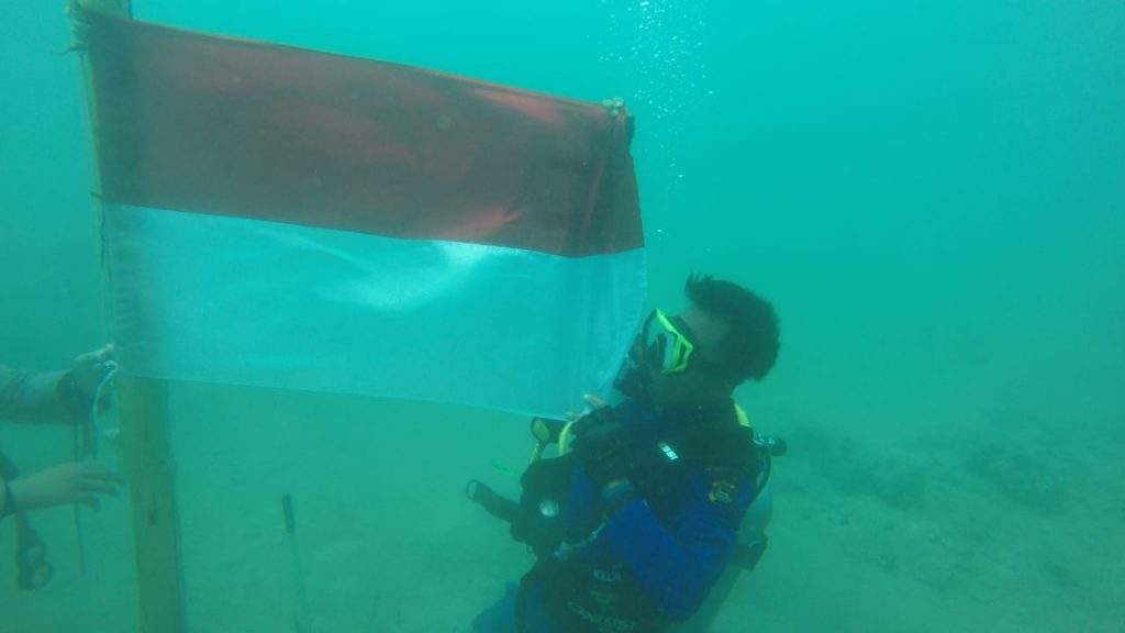 Bendera merah putih dikibarkan di dasar laut Teluk Bima dan kawasan wisata Pantai Wadu Pa’a, Kecamatan Soromandi.