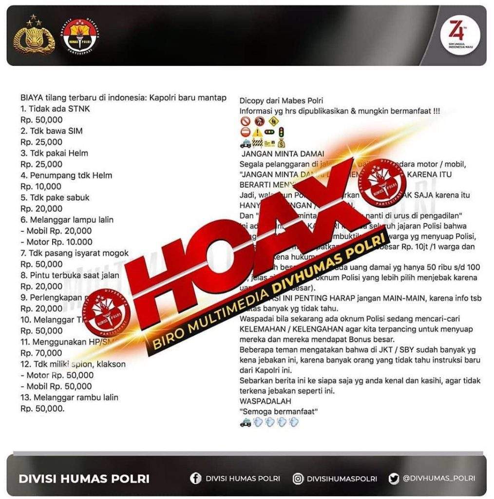 DOMPU, Lakeynews.com – Polri membantah informasi atau berita tentang biaya tilang terbaru di Indonesia yang beredar secara berantai di WhatsApp, belakangan ini.
