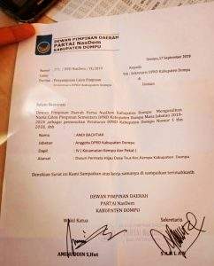 Surat usulan bernomor: 771/DPD-NasDem/IX/2019, tanggal 17 September 2019 itu ditandatangani Wakil Ketua DPD NasDem Dompu Aminuddin dan Sekretaris Sahlan.