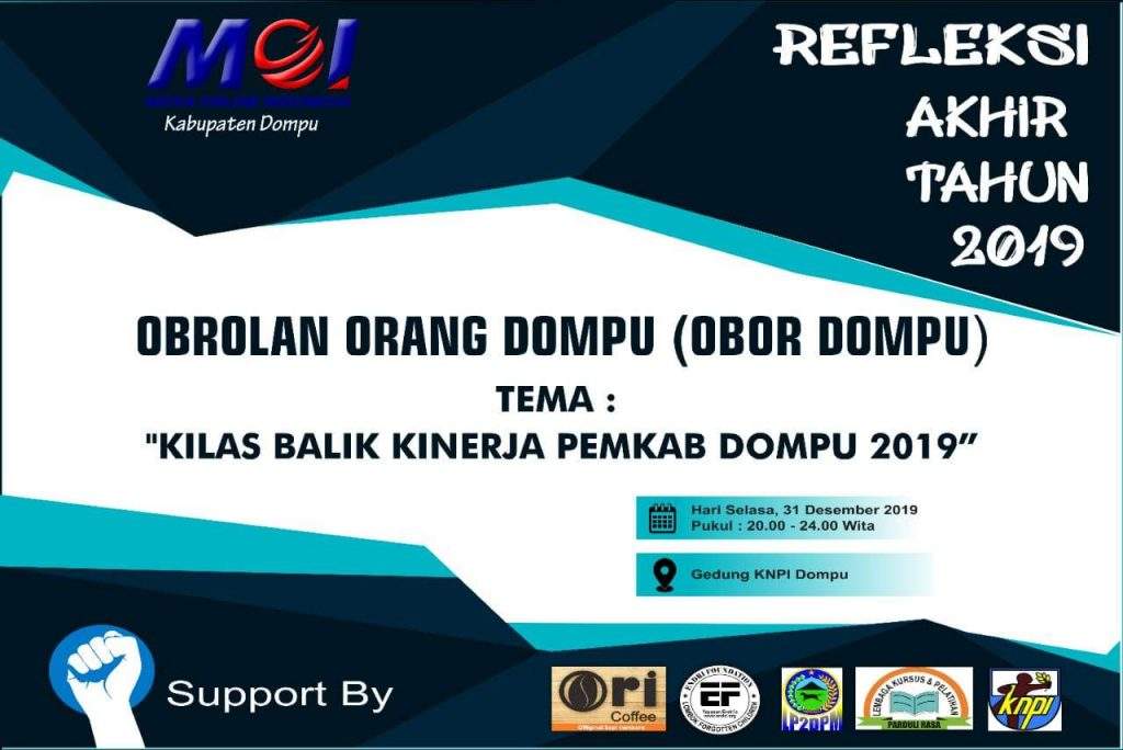 Diskusi tersebut digelar perhimpunan Media Online Indonesia (MOI) Kabupaten Dompu, daerah Nggahi Rawi Pahu. Kegiatan yang dibungkus dalam forum “Obrolan Orang Dompu (OBOR Dompu)” itu mengusung tema; Refleksi Akhir Tahun, “Kilas Balik Kinerja Pemkab Dompu Tahun 2019”.