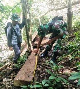 “Kayu-kayu ini naikkan ke mobil, kita angkut dulu,” perintah Danramil Kapten Inf Seninot Sri Bakti pada sejumlah anggotanya.