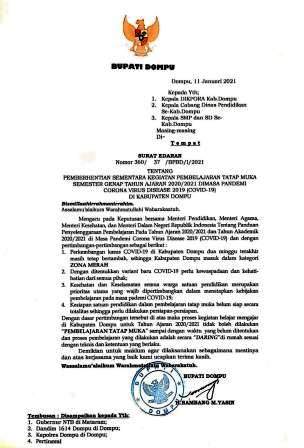 Diketahui, Bupati Dompu H. Bambang M. Yasin menerbitkan Surat Edaran (SE) Nomor: 360/37/BPBD/I/2021 tentang Pemberhentian Sementara Kegiatan Pembelajaran Tatap Muka Semester Genap Tahun Ajaran 2020/2021 Dimasa Pandemi Corona Virus Disease 2019 (Covid-19) di Kabupaten Dompu.