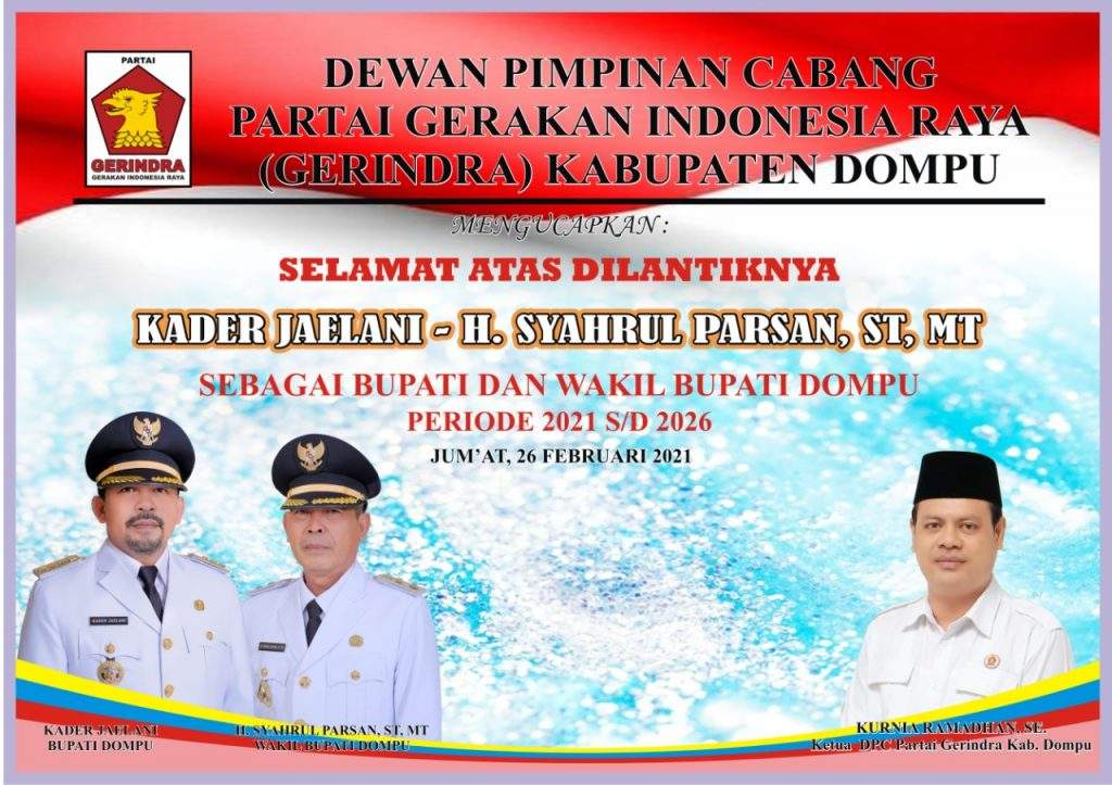 Ketua DPC Partai Gerakan Indonesia Raya (Gerindra) Kabupaten Dompu, Kurnia Ramadhan, SE, Mengucapkan Selamat atas Dilantiknya Bapak Kader Jaelani dan Bapak H. Syahrul Parsan, ST, MT (AKJ-Syah) sebagai Bupati dan Wakil Bupati Dompu Periode 2021-2026.