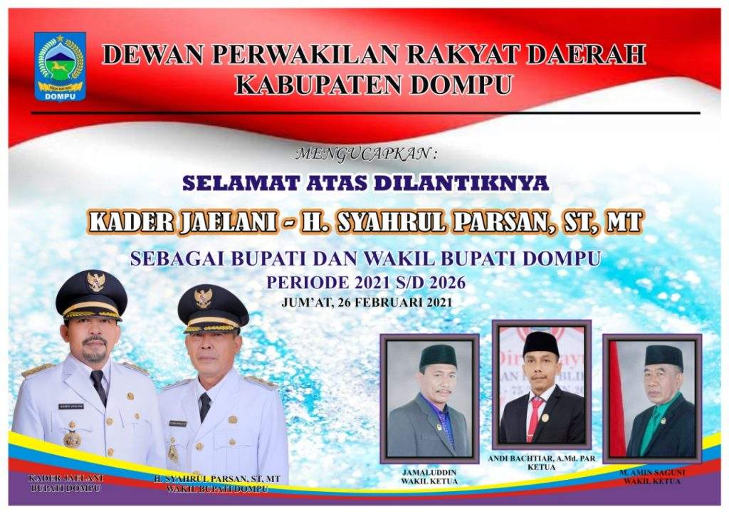 Ketua DPRD Kabupaten Dompu, Andi Bachtiar, A.Md. Par., Mengucapkan Selamat atas Dilantiknya Bapak Kader Jaelani dan Bapak H. Syahrul Parsan, ST, MT (AKJ-Syah) sebagai Bupati dan Wakil Bupati Dompu Periode 2021-2026.