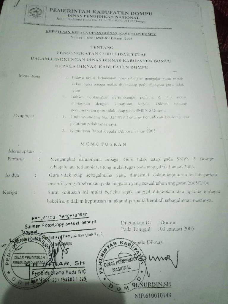 Dia sudah lama mengabdi sebagai guru honor di SMPN 5 Dompu. Mengabdi sejak sekolah itu berdiri tahun 2005. Sekitar 16 tahun lalu.