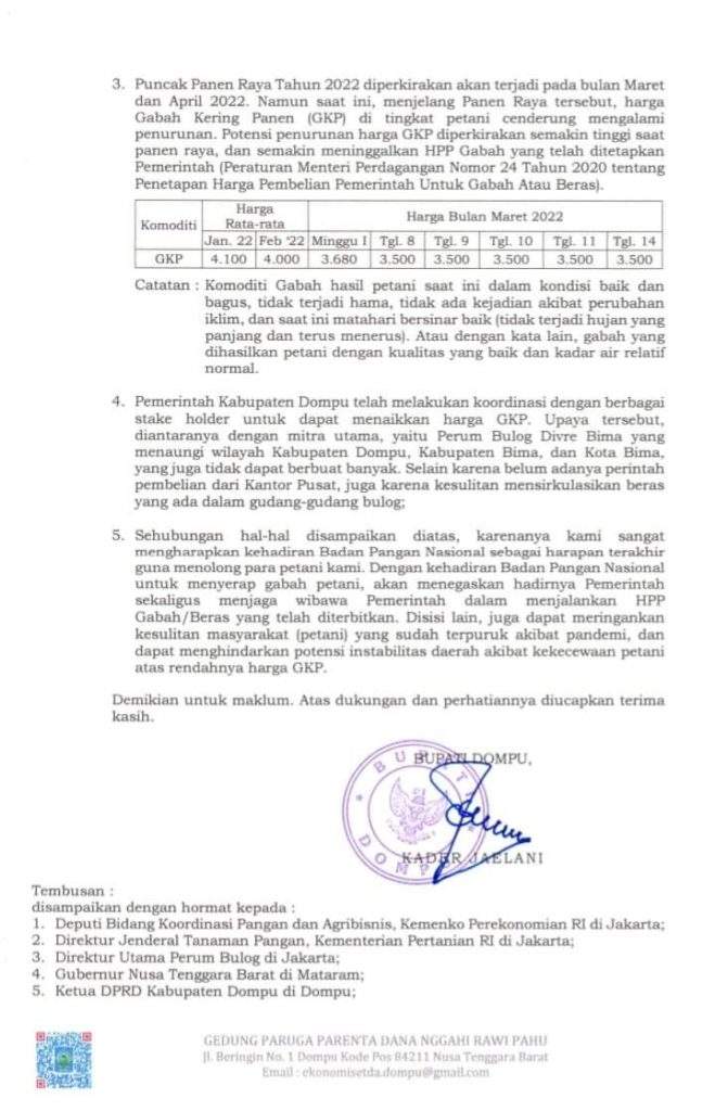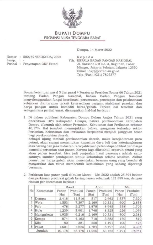 Berikut surat Bupati Dompu Kader Jaelani kepada Kepala Badan Pangan Nasional, tanggal 14 Maret 2022:
