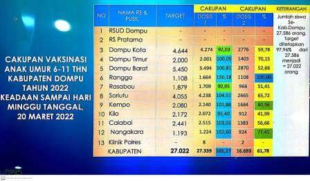 Hingga Minggu, 20 Maret 2022, sekitar pukul 13.18 Wita, pemberian vaksinasi Dosis 1 pada anak-anak Bumi Nggahi Rawi Pahu, sudah 101,17 persen. Dari target 27.022 orang justru tervaksinasi sebanyak 27.339 orang.