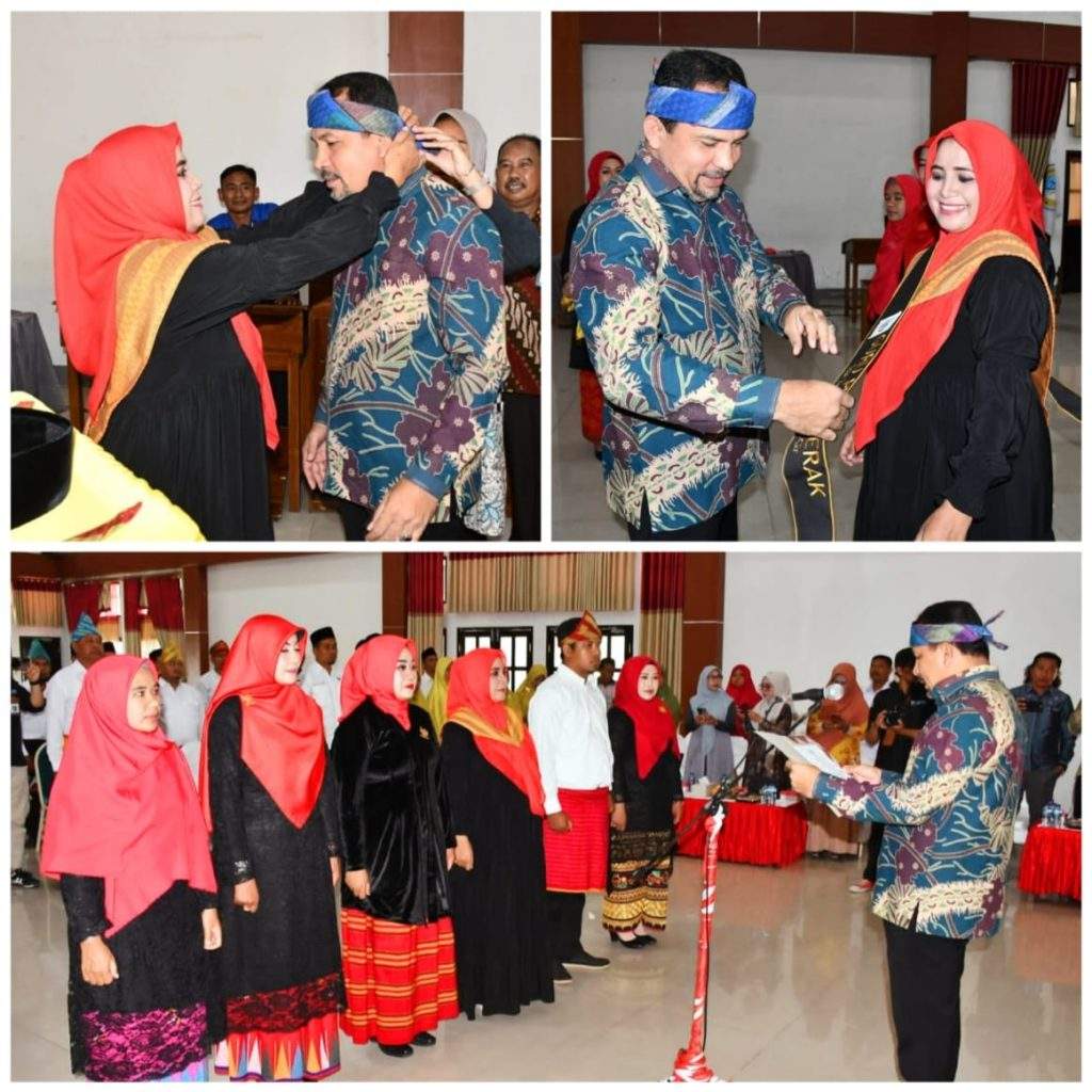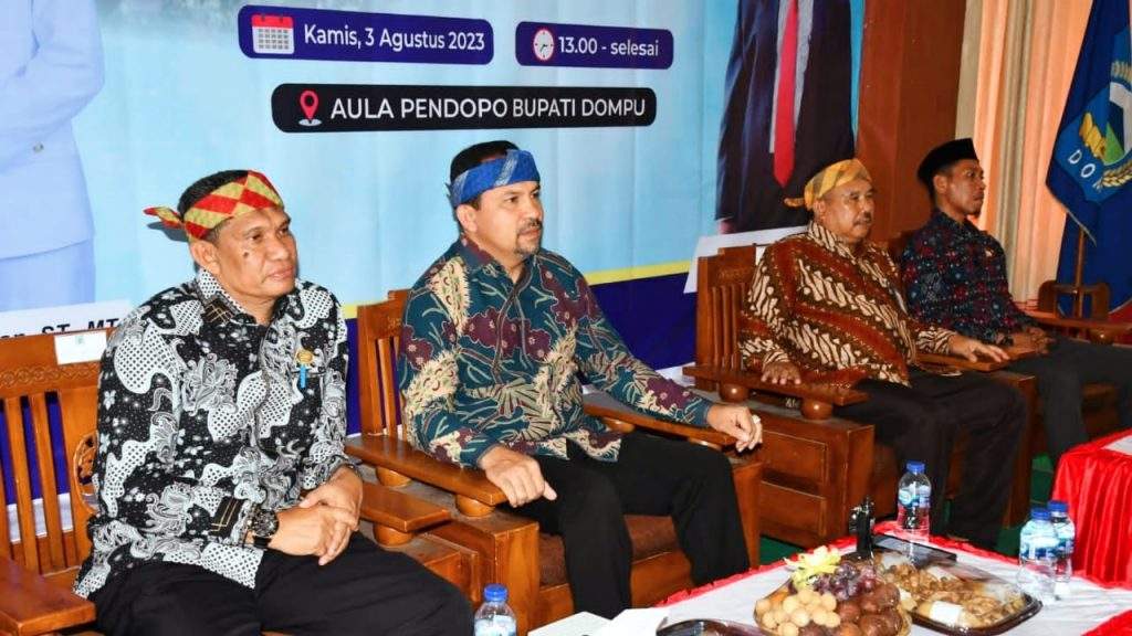 Saat masuk aula pendopo, Bupati Kader, kepala BGP dan Kadis Dikpora disambut dengan pemasangan Sambolo Muna Pa’a (ikat kepala hasil tenunan tradisional) Dompu oleh Ketua KGP Kabupaten Dompu Ida Faridah.