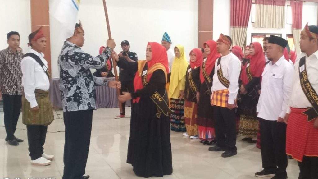 Kemudian pengucapan kata-kata pengukuhan oleh Bupati yang dilanjutkan dengan penyerahan Sertifikat GP secara simbolis kepada lima perwakilan guru.