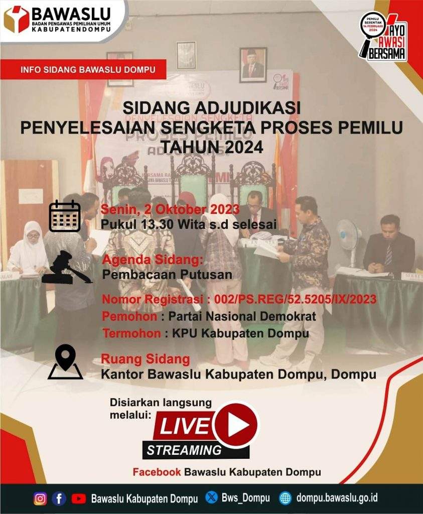 DOMPU – Bawaslu Kabupaten Dompu memastikan, Sidang Ajudikasi Pembacaan Putusan Sengketa Proses Pemilu 2024 antara Partai NasDem/Bacaleg Muttakun sebagai Pemohon dengan KPU Kabupaten Dompu sebagai Termohon, siap dilaksanakan hari ini, Senin (2/10/23).