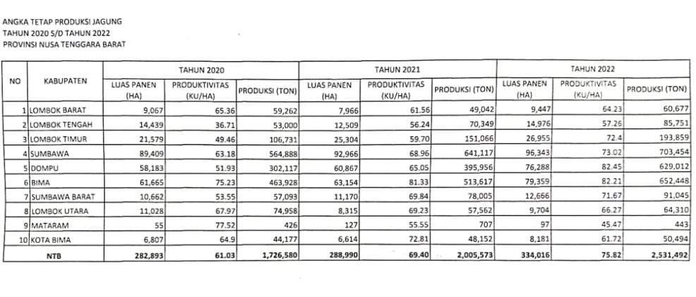 Kepastian Dompu menjadi daerah yang memiliki angka rata-rata produktivitas jagung tertinggi se-NTB 2022, jelas Dae Roni, setelah dilakukan sinkronisasi dan pembahasan series data, serta dengan menggunakan metode Kerangka Sampel Area (KSA) oleh BPS Provinsi NTB.