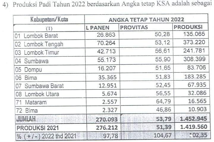 Dan, hal itu dilakukan dalam Rapat Sinkronisasi dan Penetapan Angka Tetap (ATAP) Produksi dan Produktivitas Tanaman Pangan 2022 Tingkat Provinsi NTB yang berlangsung di Ruang Rapat Oriza Sativa Distanbun Provinsi NTB, 31 Oktober lalu.