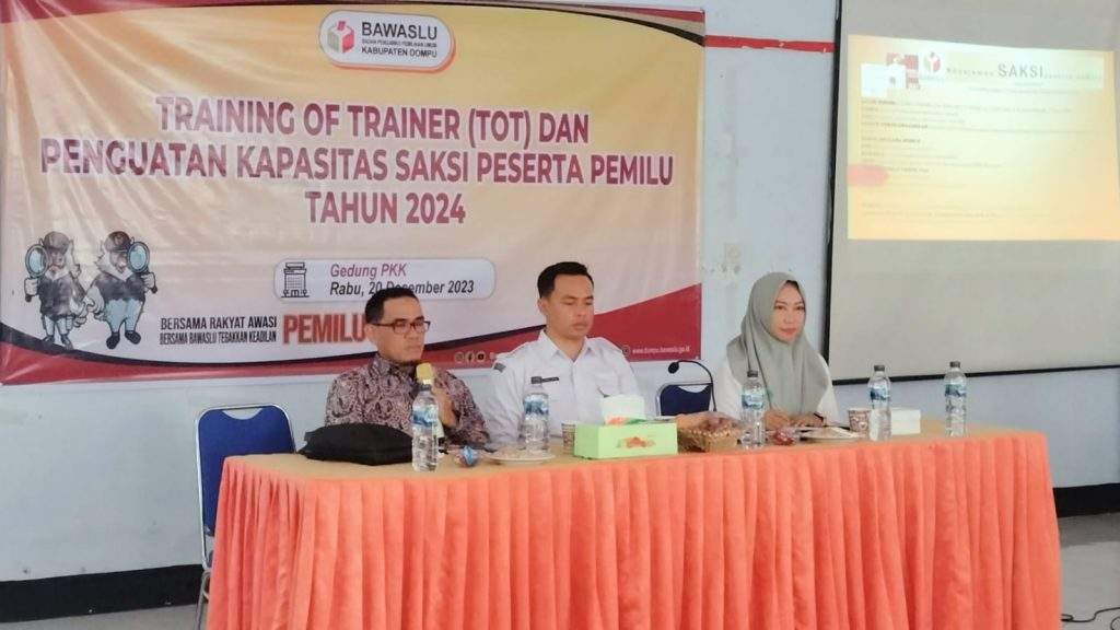 Karena itu, Badan Pengawas Pemilu (Bawaslu) Kabupaten Dompu menyelenggarakan “Training of Trainer (ToT) dan Penguatan Kapasitas Saksi Peserta Pemilu Tahun 2024”, di Gedung Darma Wanita Dompu, Rabu (20/12/2023).