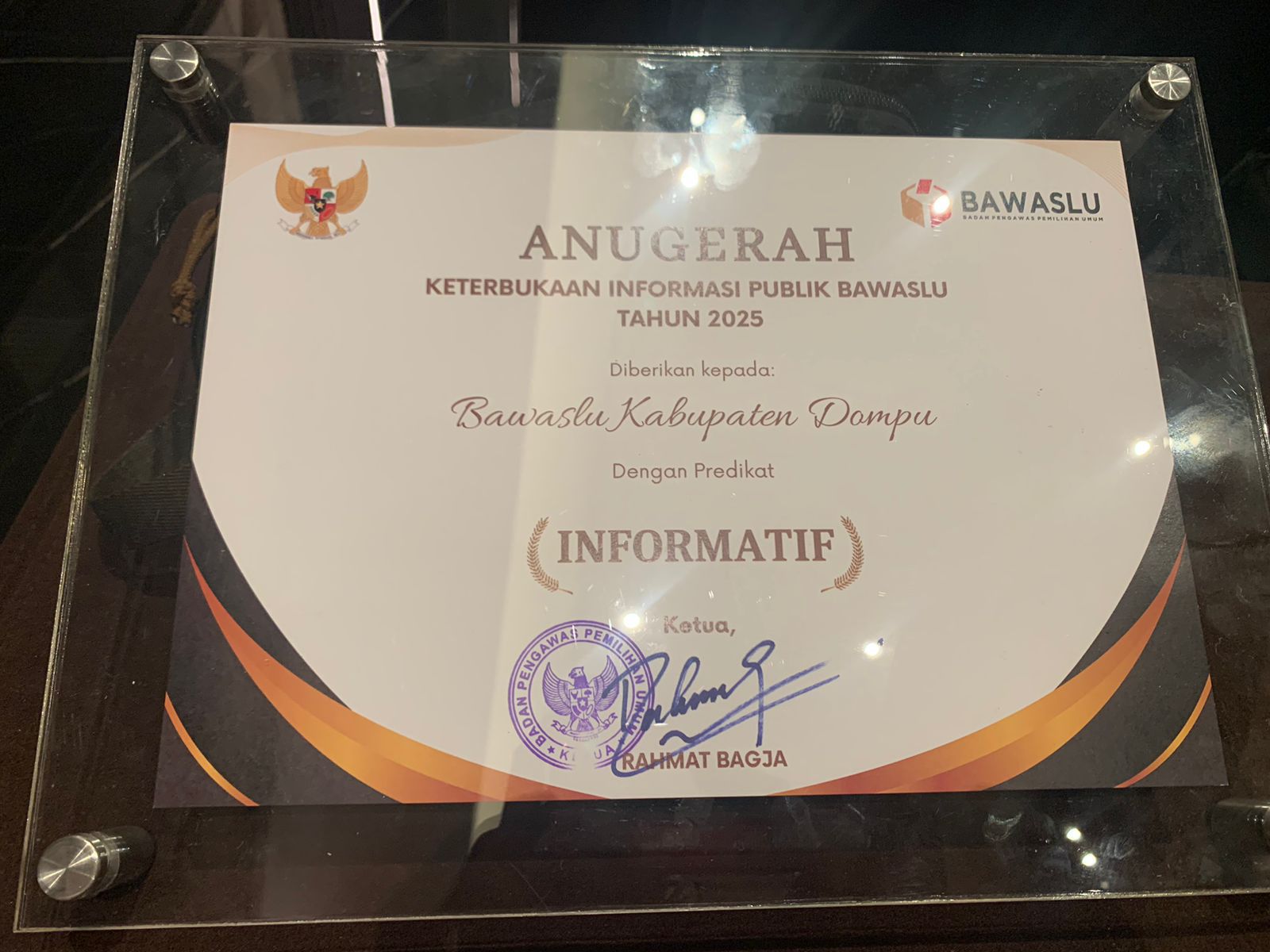 Penghargaan tersebut diterima Ketua Bawaslu Kabupaten Dompu Irwan pada malam penganugerahan yang berlangsung di Hotel Claro Makassar, Sulawesi Selatan, Selasa (16/9/2025).