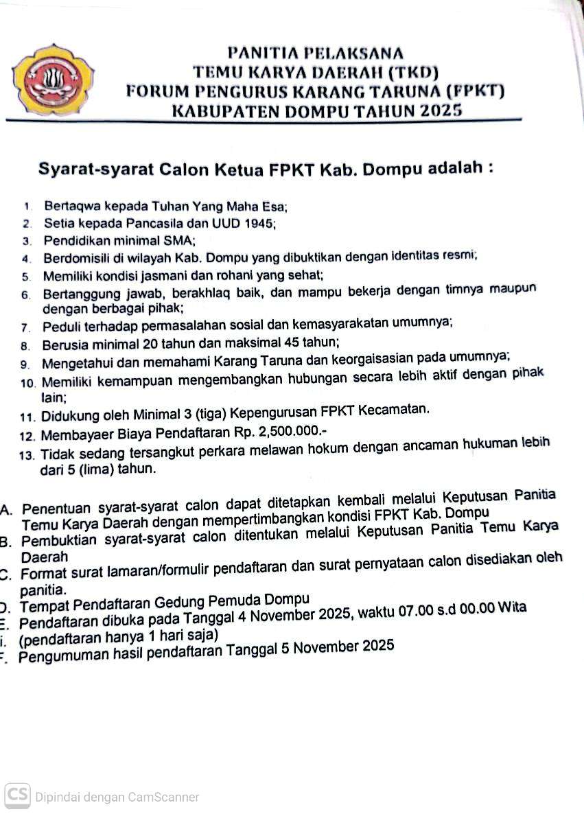 DOMPU – Forum Pengurus Karang Taruna (FPKT) Kabupaten Dompu akan melaksanakan pemilihan Calon Ketua untuk Periode 2025-2029.