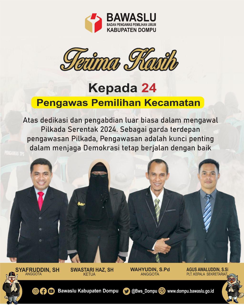 KPU Kabupaten Dompu, Nusa Tenggara Barat (NTB) menyampaikan ucapan terima kasih kepada seluruh anggota PPK, PPS, Pantarlih, KPPS, Petugas Ketertiban, dan segenap masyarakat Kabupaten Dompu atas dedikasi...