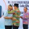 Bupati Dompu H. Kader Jaelani didampingi Wakil Bupati H. Syahrul Parsan menyematkan kopiah sebagai cinderamata kepada Pj Gubernur NTB H. Lalu Gita Ariadi di Pendopo Bupati, Minggu (22/10/23). (ist/lakeynews) DOMPU...